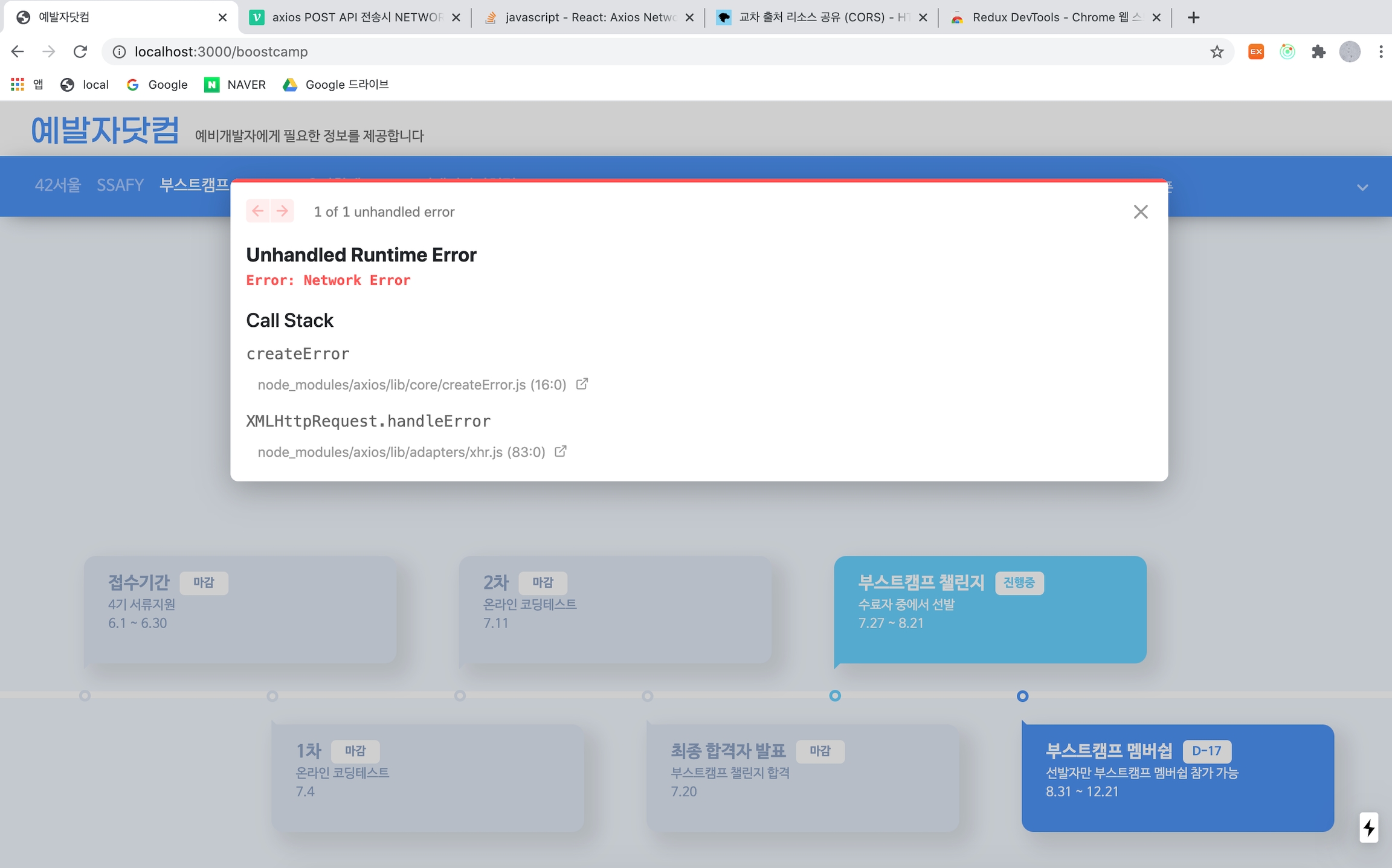 엑시오스를 사용하면 Network Error가 난다. CORS(교차출처리소스공유) 정책에 의한 오류이다. 허가되지 않는 곳에서 리소스를 요청하면 보안상 위협이 되기 때문에 요청을 받는 곳에서 CORS를 허용해줘야한다.